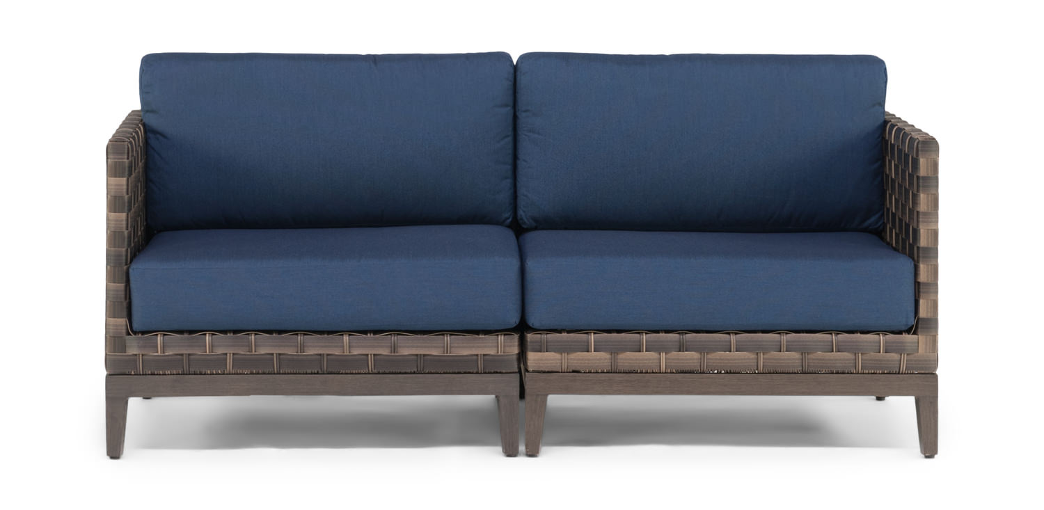 The Lennox Modular Wicker Settee features great flexibility and is constructed of weather resistant aluminum frames, with a very modern, 40mm wide wicker weave. Spectrum Indigo, a Sunbrella fabric, is used to cover the back and seat cushions. Sunbrella fabrics are well known for their quality, and reliability in this outdoor furnishings category. The blue, is deep and delightful, and blends well with the flat, brush beige finish of the wide wicker. The Lennox collection, was intended, by design, to include a comfort experience known of indoor living, to that of the outdoor seating. Custom orders are not available with this collection.