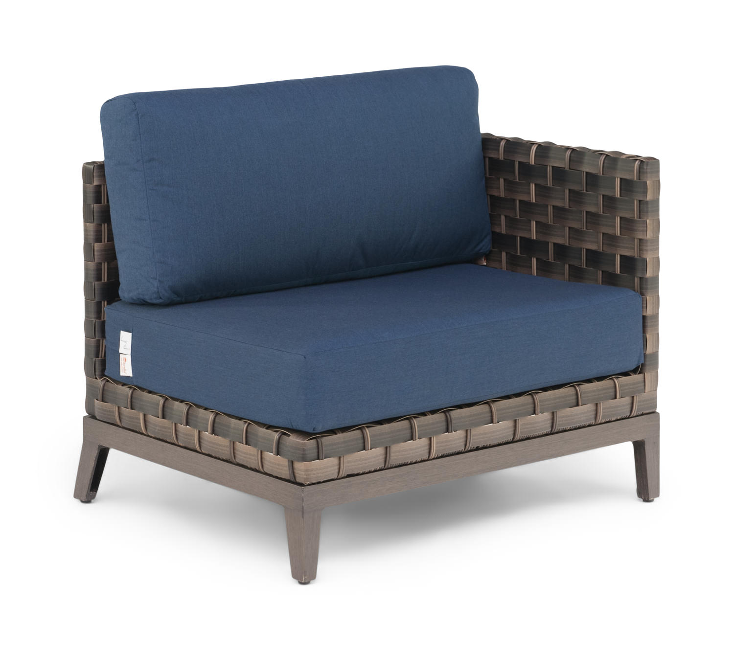 Contemporary styling, with a quality, aluminum frame, the Lennox Right Arm Seat with cushions, is a modular piece which will suit your own unique design. The large, 40mm flat weave, features a hand brushed, beige finish. The cushions are covered in the Sunbrella fabric, Spectrum Indigo. A rich and relaxing blue, this fabric is perfect for the outdoors and requires little maintenance. This outdoor furniture has been constructed with the familiar comfort of indoor furniture, using a perennial decking which may actually be replaced, if necessary, and allows for quick drying.
