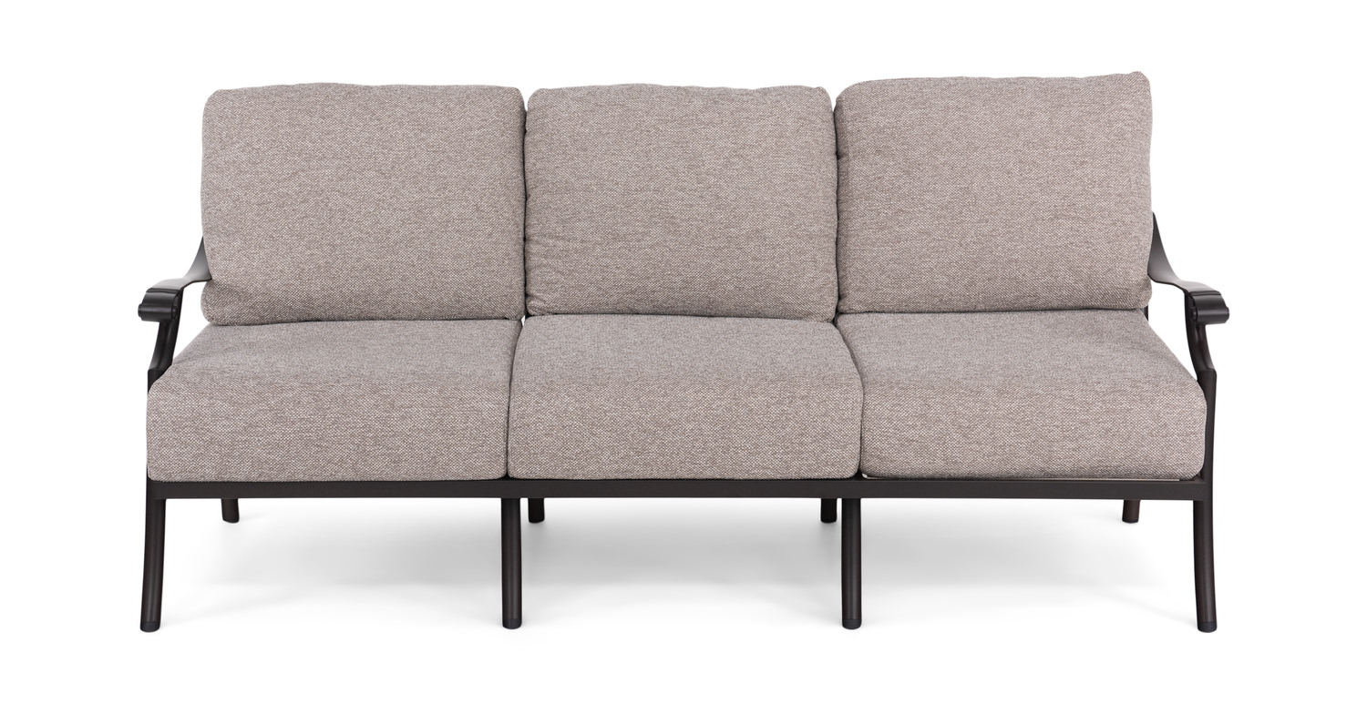 Introducing the Montreux Cushion Sofa, a luxurious addition to your outdoor living space brought to you by HOM Furniture and Tropitone. This patio sofa combines comfort and style seamlessly with its custom order options available. The sling fabric in beige grey complements the rich earth finish of the aluminum frame beautifully, creating a sophisticated look that will elevate any outdoor setting. The blue point cement fabric adds a touch of elegance to the transitional style of this piece. Perfect for outdoor use, this patio sofa is designed for both durability and comfort.