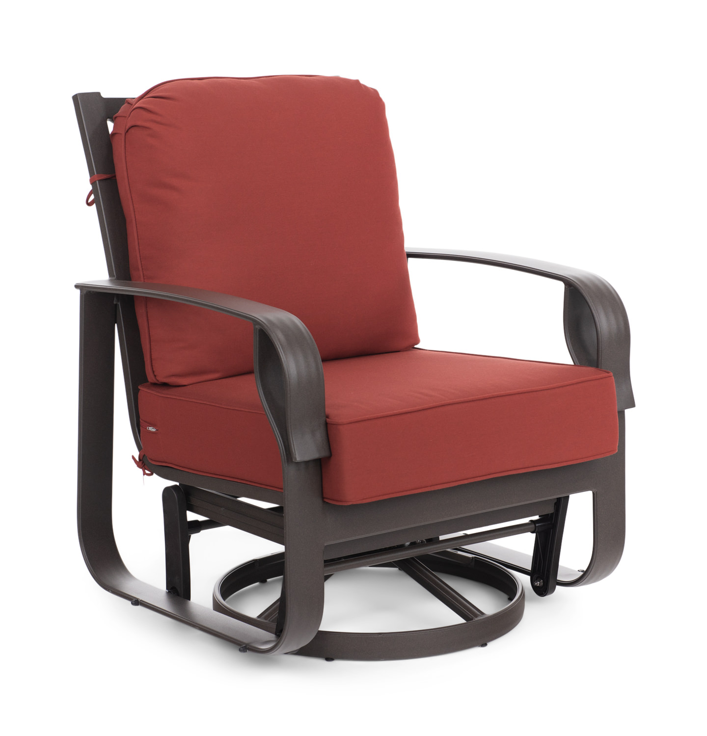 The San Remo II Swivel Glider Club Chair by Thomas Cole Designs, a perfect blend of comfort and style for your outdoor space! Crafted with a durable aluminum frame in a sleek speckled brown powder coat finish, this patio chair is designed to withstand the elements with ease. With the smooth gliding mechanism and swivel option, you can relax in the outdoors with ease. The Henna SunSeal cushion fabric not only adds a pop of color with its rich red hue but is also 100% solution-dyed acrylic for long-lasting vibrancy. This swivel glider club chair is ideal for lounging in your backyard oasis, offering a casual and inviting vibe to your outdoor area.