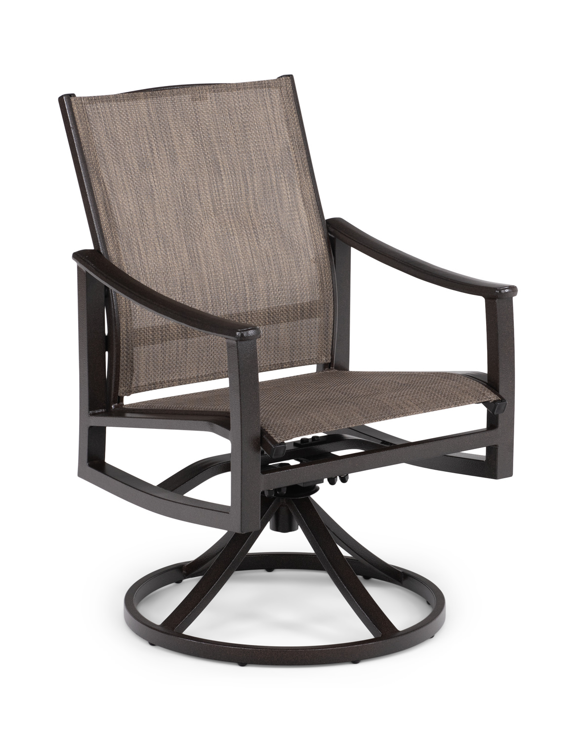 The Summit Sling Swivel Rocker from HOM Furniture's exclusive Furniture Creations Direct line! This patio chair boasts a beautiful brown rich earth finish, perfectly complemented by a sturdy cast and extruded aluminum frame. The phifertex fabric provides both comfort and durability for all your outdoor gatherings. Designed for your relaxation and enjoyment, this transitional style chair is ideal for any outdoor space. While assembly is required, you'll find it easy to put together for immediate use. With its brown color and sleek aluminum material, this chair is sure to enhance your patio decor.
