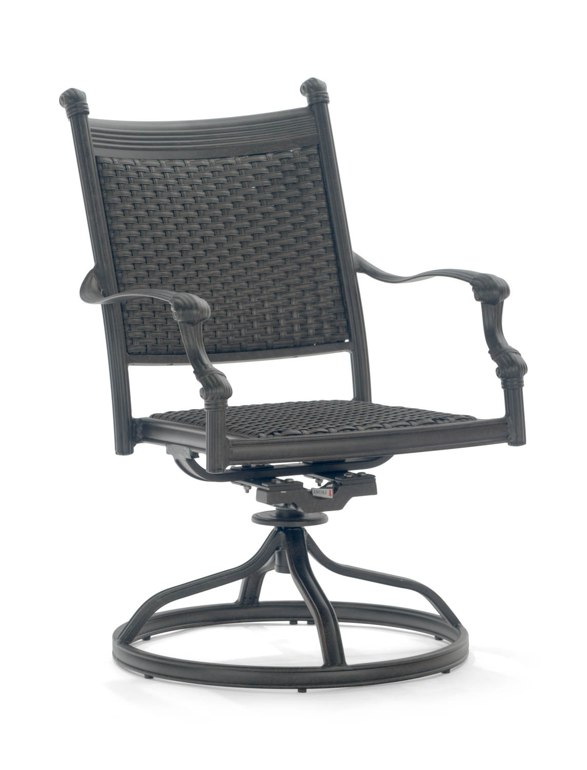 The Veranda Woven Swivel Rocker Chair, by Thomas Cole, was created for the Seasonal Concepts department located inside HOM Furniture showrooms. Offering rich, powder coated aluminum frames with a premium poly-resin wicker weave, these chairs require little fuss. Both easy care and durable, Veranda is an excellent value for your backyard needs.