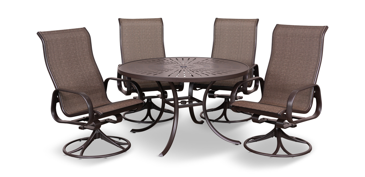 The Tropitone Capri 5 Piece Patio Dining Set from HOM Furniture! This exquisite outdoor furniture set is designed to elevate your patio dining experience with style and durability. The set includes a round dining table featuring a stunning stamped aluminum La'Stratta pattern, table top on a welded aluminum base, all coated in a luxurious Rich Earth powder finish. Crafted with high-quality aluminum material, this patio dining set is built to withstand the elements while providing a comfortable and stylish outdoor dining space. The Mia II grade-a textilene fabric ensures both comfort and durability, making it the perfect choice for your outdoor gatherings.