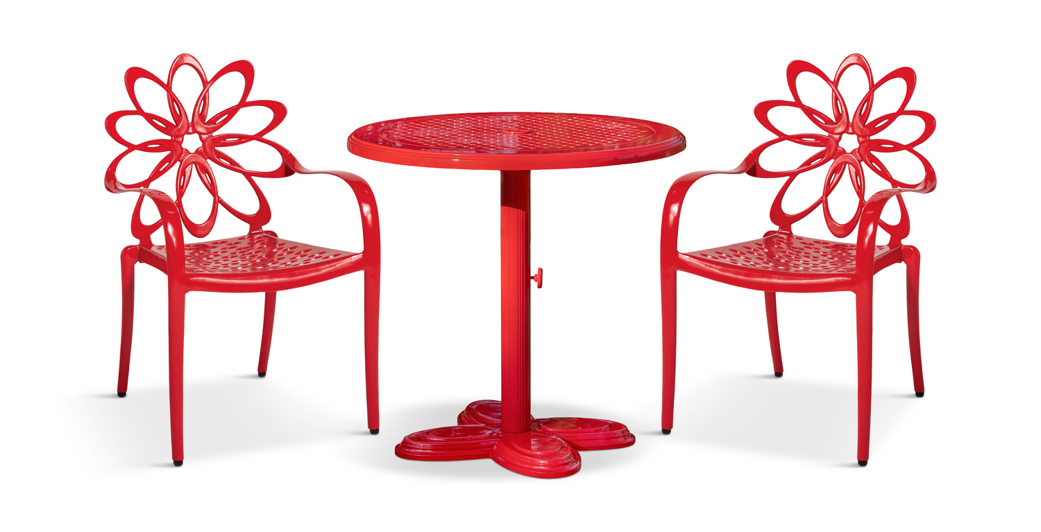 Introducing the Lotus 3 Piece Garden Bistro Set from HOM Furniture! Create a charming outdoor escape with this elegant and eye-catching set. The Lotus armchair in a stunning ruby-red finish features a unique flower petal back frame, adding a touch of sophistication to your patio. Made with a durable cast aluminum frame and powder coat finish, the Bistro umbrella table in a vibrant red color complements the chairs perfectly. Perfect for outdoor use, this patio set is designed to withstand the elements. Custom order options are available to suit your style and space.