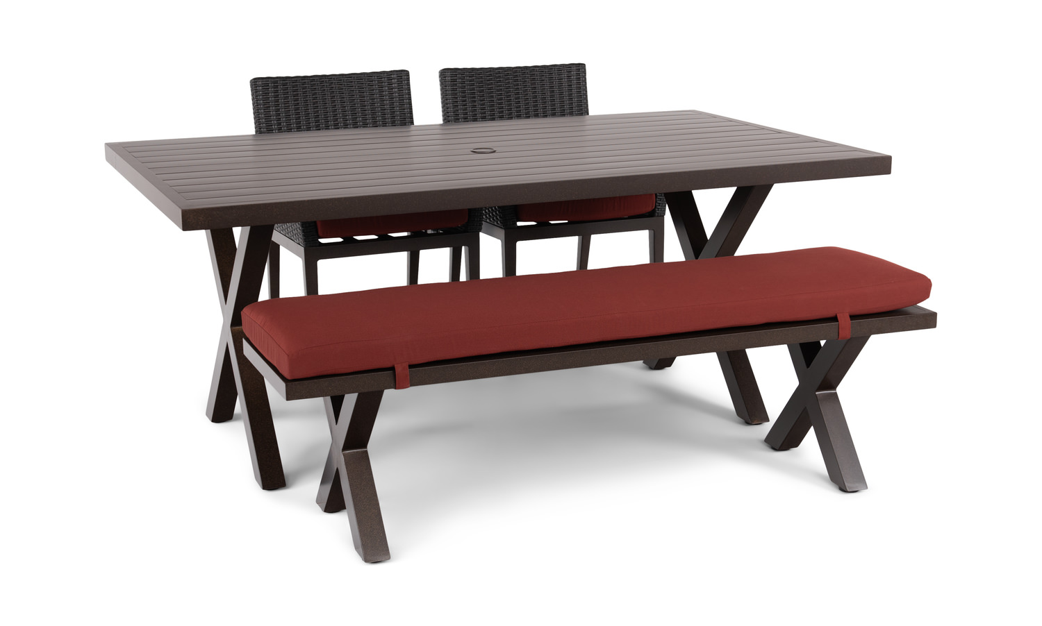 Rockport II Collection, a Thomas Cole Designs patio dining group, includes room for 4+ dining. This configuration includes 2 woven dining chairs with a 72" long rectangle dining table and a 63" long dining bench. The slat-top table design has an umbrella hole to accommodate a standard umbrella pole, the umbrella is sold separately. Sedona brown finish on an aluminum frame with poly-resin weave seat buckets, for easy care. SunSeal seat pads are included in the Henna color. SunSeal is a 100% solution-dyed acrylic fabric that is easy to care for and fade-resistant. Protective outdoor furniture set cover available, sold separately.
