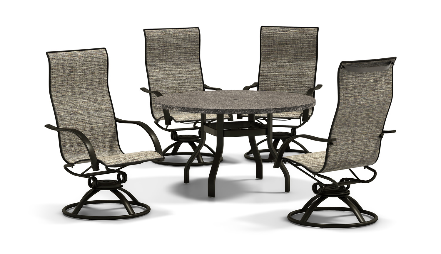 Enjoy outdoor dining, reading, or relaxing with this 5 piece dining set that is made in Minnesota, by Homecrest Outdoor Living. The Stella collection includes these high-back swivel rocker chairs paired with a faux stone table collection called Shadow Rock, finished in a boulder color tone. Available in a variety of color combinations and fabrics by special order. This set is available in stock as shown in an Umber finish with a quick-drying Napa Brindle textilene fabric. Limited assembly is required. Protective furniture covers for off-season storage are available and sold separately. Shown in select Seasonal Concepts departments in HOM Furniture showrooms.