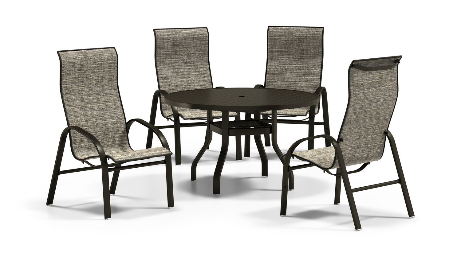 One of top selling patio collections from Homecrest, the Stella 5 Piece Patio Dining Set is made from heavy-duty, rust resistant, aluminum frames with durable Phifertex chair seat fabric slings crafted to Homecrest's double-layer sling standard for comfort and durability. The Latitude slat top table is paired with four Stella high-back arm dining chairs. Stella is not just for dining, with the comfort factor, many will enjoy this set for outdoor lounging all season long. This sling style is cooler in the summer heat and dries quickly from rain or easy spill clean-up. Available in stock as shown or custom order options are available. Shown in select HOM Furniture showroom's Seasonal Concepts departments for customers to experience. See a sales associate for custom orders and additional in-stock options available for outdoor living. Do not forget to ask about protective outdoor furniture covers available in a variety of formats for off-season storage.