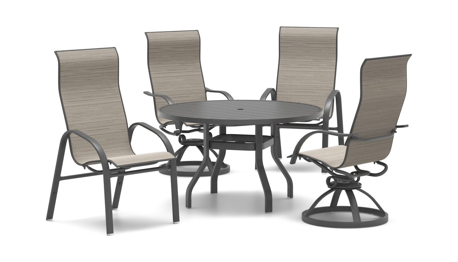 Transform your outdoor space into a stylish and inviting oasis with the Stella II 5 Piece Patio Set from HOM Furniture. This patio set includes two swivel rockers and two dining chairs, perfect for entertaining guests or enjoying a peaceful meal outdoors. Crafted with precision and care, this set features a sleek Latitude slat top table with an aluminum frame finished in carbon for a modern touch. Designed for comfort and durability, the shadows fabric adds a touch of elegance to your patio decor. The transitional style of this set effortlessly blends with any outdoor setting, while the round shape of the dining table adds a contemporary flair.