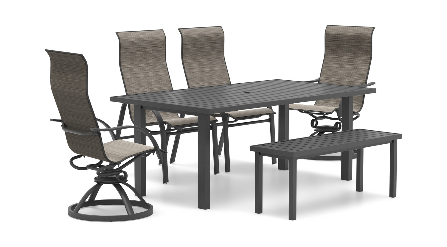Elevate your outdoor dining experience with the Stella II 5 Piece Patio Set from HOM Furniture. This stylish set includes a 48" dining bench, two swivel rockers, and two dining chairs, providing ample seating for your family and guests. The shadows fabric adds a touch of elegance to the set, while the Latitude 74" slat top table offers plenty of space for meals and gatherings. Crafted with an aluminum frame in a sleek carbon finish, this patio set is both durable and stylish. The powder coat finish ensures long-lasting protection against the elements, making it perfect for outdoor use. Custom orders welcome.