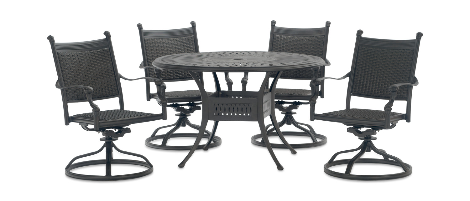 The Veranda 5 Piece Swivel Patio Dining Set by Thomas Cole was created for the Seasonal Concepts department located inside HOM Furniture showrooms. Crafted with rich powder coated aluminum frames with a premium poly-resin wicker weave for easy care and durability. Veranda is an excellent value, the set includes a 48" round cast aluminum top table and four swivel rockers.