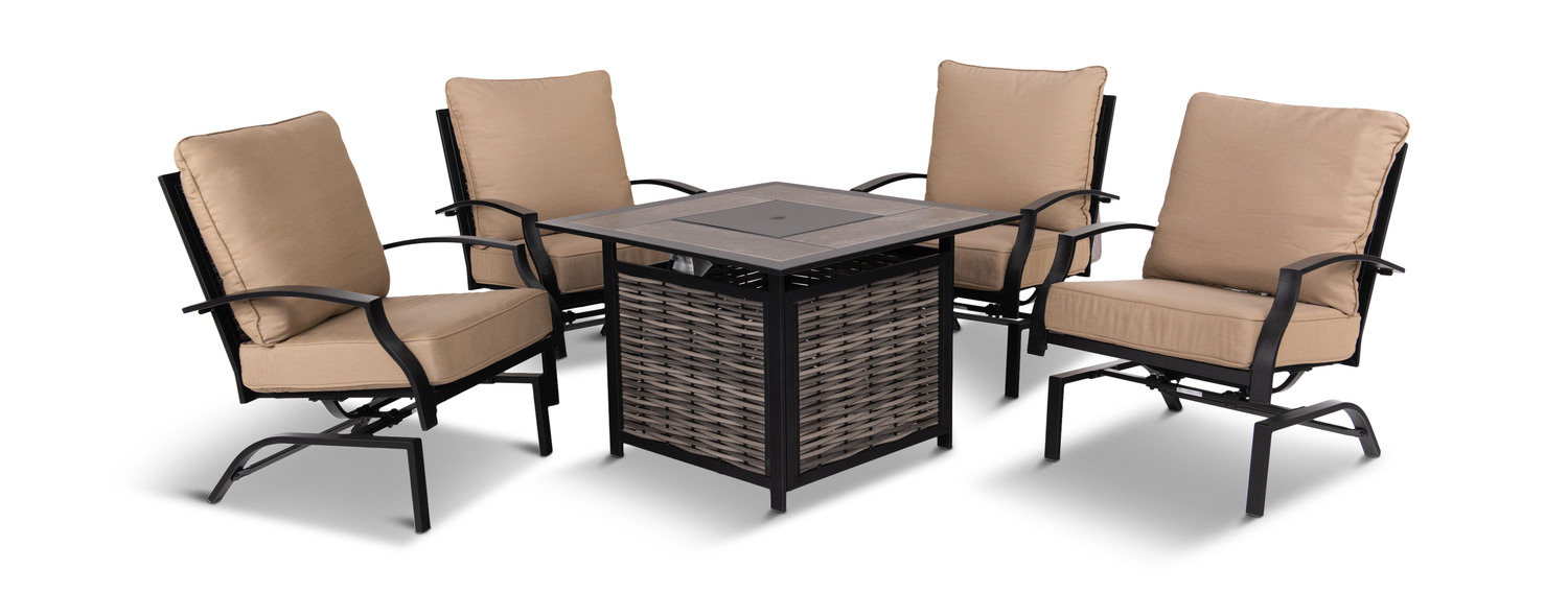 The Weston II 5 Piece Fire Table Group is made to enjoy life outdoors with family and friends. This set features steel frames finished in a dark brown, accented with fire table top tiles and push outdoor cushions on the motion chairs. The square fire table (37") is designed to gather around with an easy-to-start battery-operated ignition system. Fueled by a standard 20lb LP tank, sold separately. The four club rocker chairs provide easy care comfort for the gatherings. Cushion fabric is a durable, 100% solution dyed acrylic outdoor fabric, SunSeal, in a heather beige color tone. Assembly is required. Shown in HOM Furniture, Seasonal Concepts departments. Sold as a set only. Outdoor furniture protective covers are recommended when not in use to keep these plush cushions clean, dry, and ready to gather. Covers for set or individual items are available separately. Assembly required.