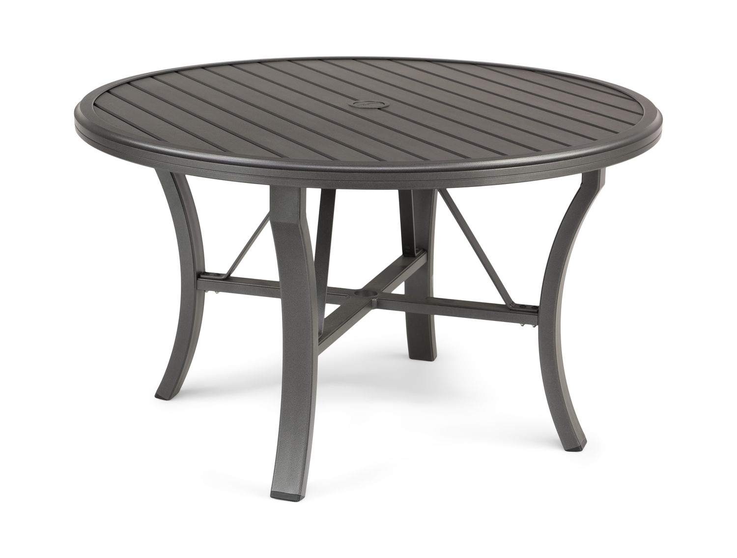 The Banchetto 48" Round Dining Table features a commercial grade aluminum frame and slat top design.