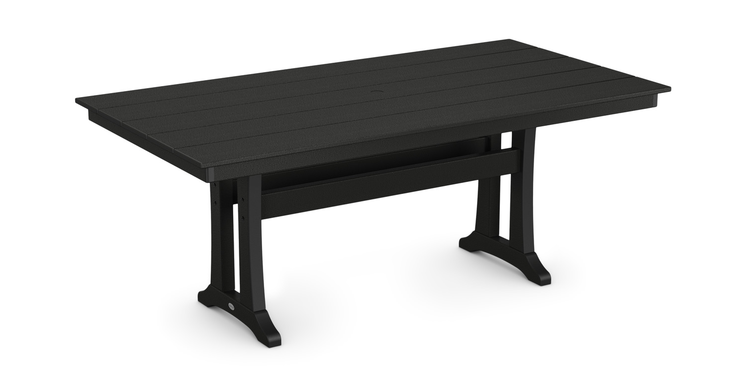 The Farmhouse Trestle Dining Table from HOM Furniture! Elevate your outdoor dining experience with this beautifully crafted piece, perfect for your patio or backyard. Made from recycled HDPE polywood in a classic traditional black finish, exudes timeless elegance. With a convenient dining table height of 29 inches and a spacious rectangular shape, this table is designed for gatherings and meals with loved ones. Special order your color for your outdoor space. Assembly required