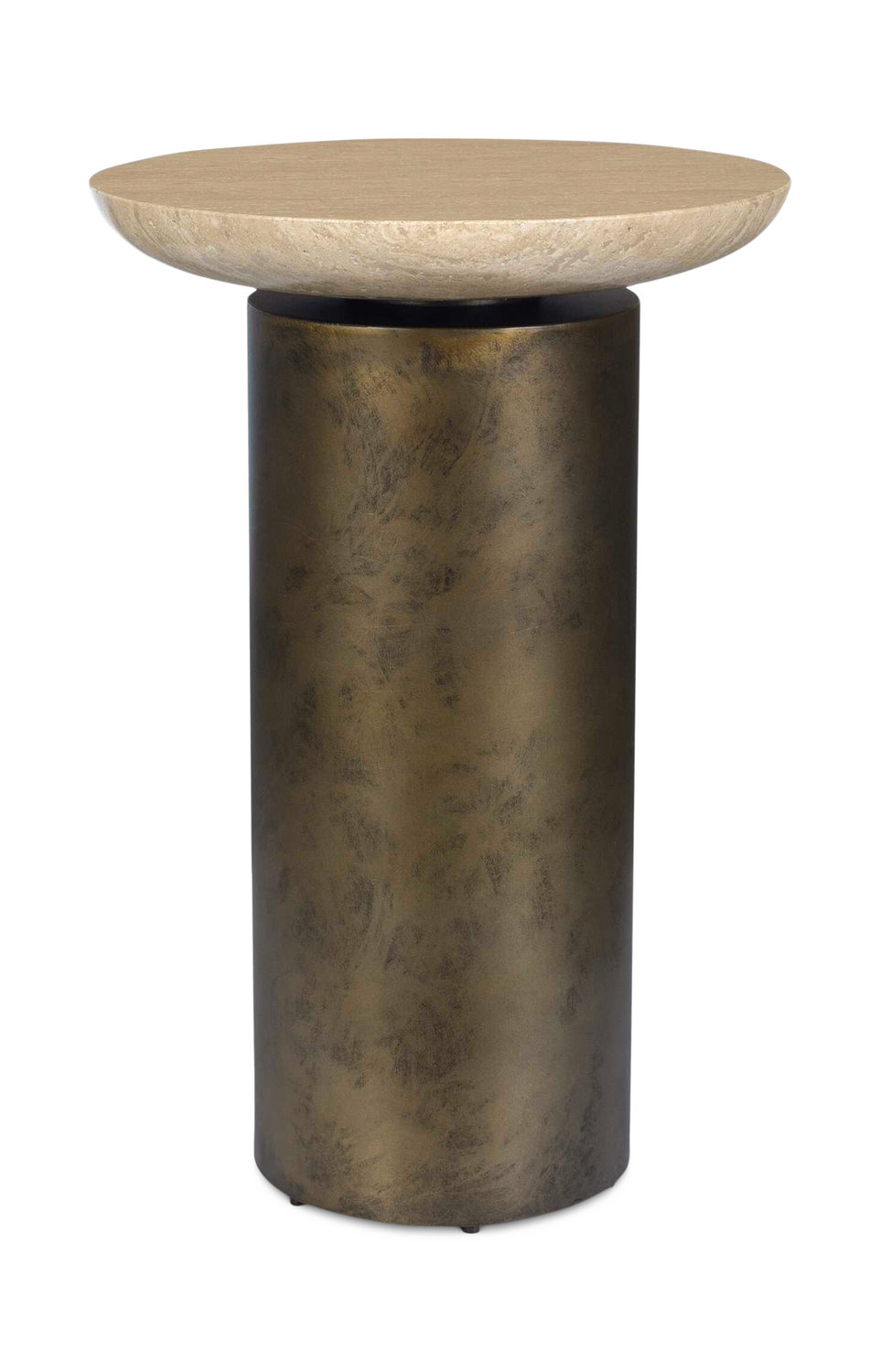 - This Contemporary Accent Table Showcases A Captivating Contrast Between Its Sleek, Antique Brass Iron Base And Its Travertine Top. Because Of The Natural Characteristics Of Stone, Each Piece Will Have Unique Color And Variation. Suitable For Both Indoor And Outdoor Use.
