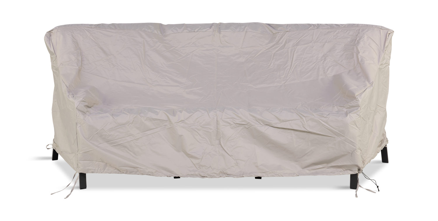A Thomas Cole Designs protective cover for crescent shaped sofas. Sold separately, this cover is crafted to fit San Tropez II crescent shape sofa or comparable size. Generously made from a grey PVC material that is moisture resistant and vented to protect outdoor sofa from the elements, keep the couch dry, clean and ready to use. Available as shown.