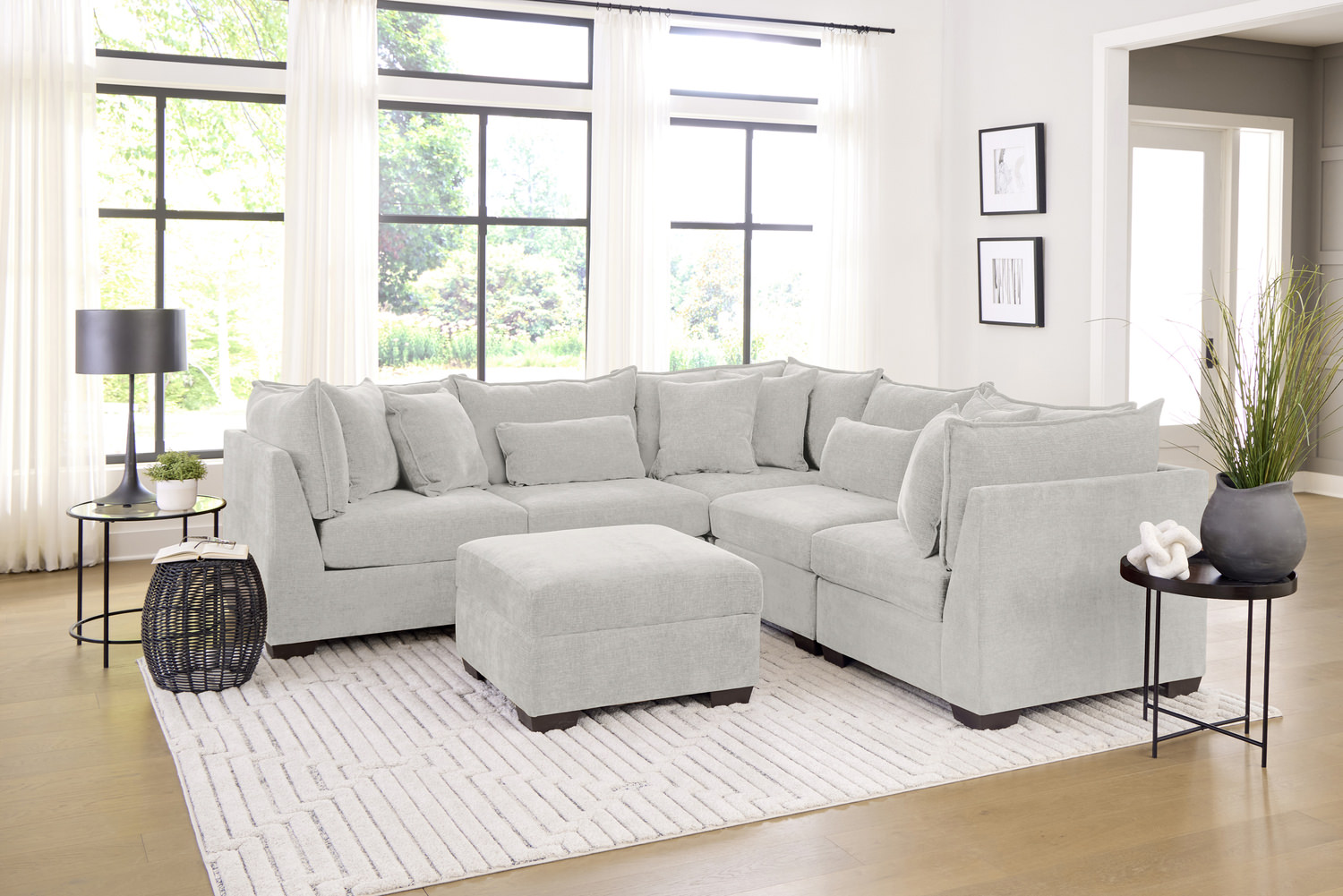 Upgrade your living space with the Dino 5 Piece Sectional from HOM Furniture! This stunning sectional features a durable engineered and hardwood frame with steel spring suspension for ultimate comfort and support. The high-resiliency and CertiPUR-US certified cores ensure long-lasting quality. The performance fabric in a beautiful color adds a touch of elegance to your home. With multiple configurations available and a transitional style, this sectional is perfect for any space. Choose from other colors to match your decor. Bring style and comfort together with the Dino 5 Piece Sectional. Ottoman is sold separately.