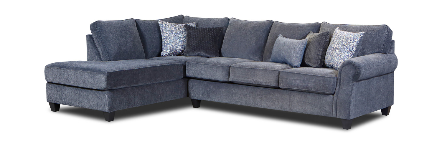 Introducing the Faith Sectional from HOM Furniture! This beautiful piece is a stunning addition to any living space, featuring a gorgeous blue cover that adds a pop of vibrance to your home decor. Crafted with a sturdy engineered and hardwood frame, this sectional is built to last. The steel spring suspension ensures optimal comfort and support, while the high-resiliency foam provides a plush seating experience that you'll love sinking into after a long day. With a transitional style that effortlessly blends modern and traditional elements, this sectional is sure to complement any interior design aesthetic.