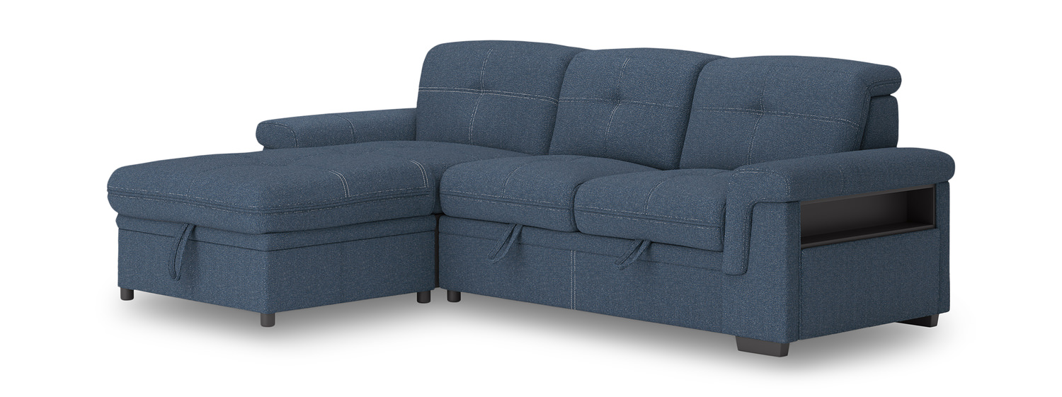 Introducing the Gisele Pop-Up Sleeper by HOM Furniture - the perfect blend of style and functionality for your living space. This modern sleeper sofa features high-quality foam cushions wrapped in poly fiber for maximum comfort and durability. The pop-up headrests add a touch of coolness, ideal for cozy movie nights or lounging sessions. Enjoy the convenience of additional storage in the outside arms, perfect for keeping essentials within reach. The spacious corner chaise with lift-top storage offers ample space to store blankets, pillows, or any other items you want to keep handy. The racket adjustable headrest allows you to find the perfect position for relaxation. Available only as shown. Simple assembly required.