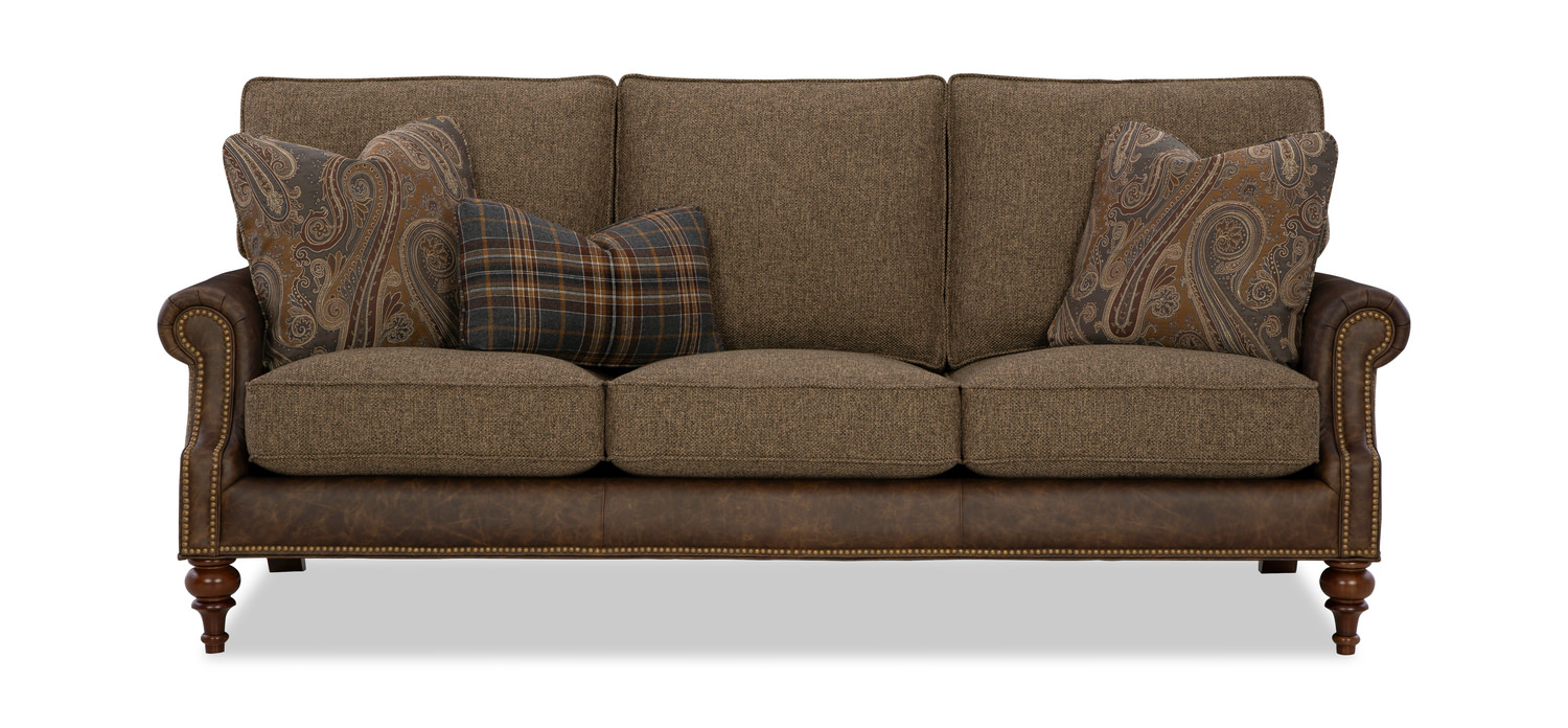 Introducing the exquisite Ralph Sofa by Craftmaster Furniture, where luxury meets sophistication. This impeccable piece boasts a captivating leather and fabric combination that effortlessly creates a striking visual appeal. Sink into unparalleled comfort with its Blend down seating and pillows, supported by sinuous seat springs for added durability. Crafted with an engineered and hardwood frame, this sofa guarantees long-lasting quality and stability. The traditional English arm design adds a touch of timeless elegance while delivering a designer look that is sure to elevate any living space. Available for special order, the Ralph Sofa from Craftmaster Furniture is a must-have for those who appreciate high-quality craftsmanship and impeccable style.