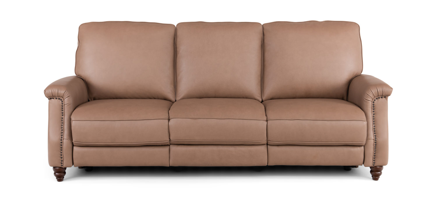 This Warren Leather Reclining Sofa is the ideal choice for casual traditional style. Featuring a durable plywood and solid wood frame, high-resiliency foam fill, and hidden motion footrests, this sofa offers comfort and relaxation in a timeless design. Accented with classic nailheads, this piece is sure to be a welcome addition to your home.