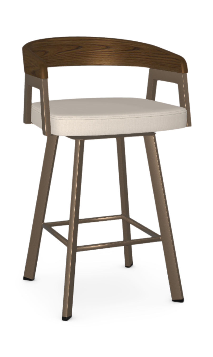 The Carmela stool has a fresh, modern design that blends seamlessly in any room. The steam-bent wood back is available in an assortment of designer finishes. The Carmela stools are stocked in the metal, vinyl, and wood selections shown, with custom order options available. Featuring a full swivel.
