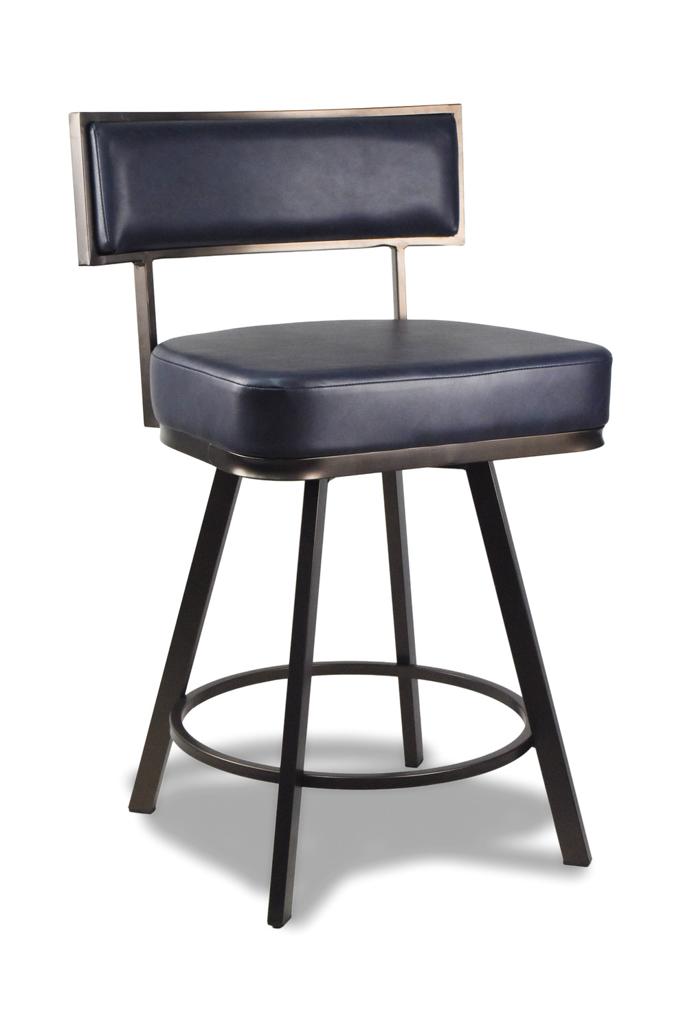 Clean, transitional style with easy-to-clean vinyl covering, the Zenith swivel stool in navy and charcoal metal is a fresh look for your island area. With a 250# weight capacity, it's sure to provide style and comfort.