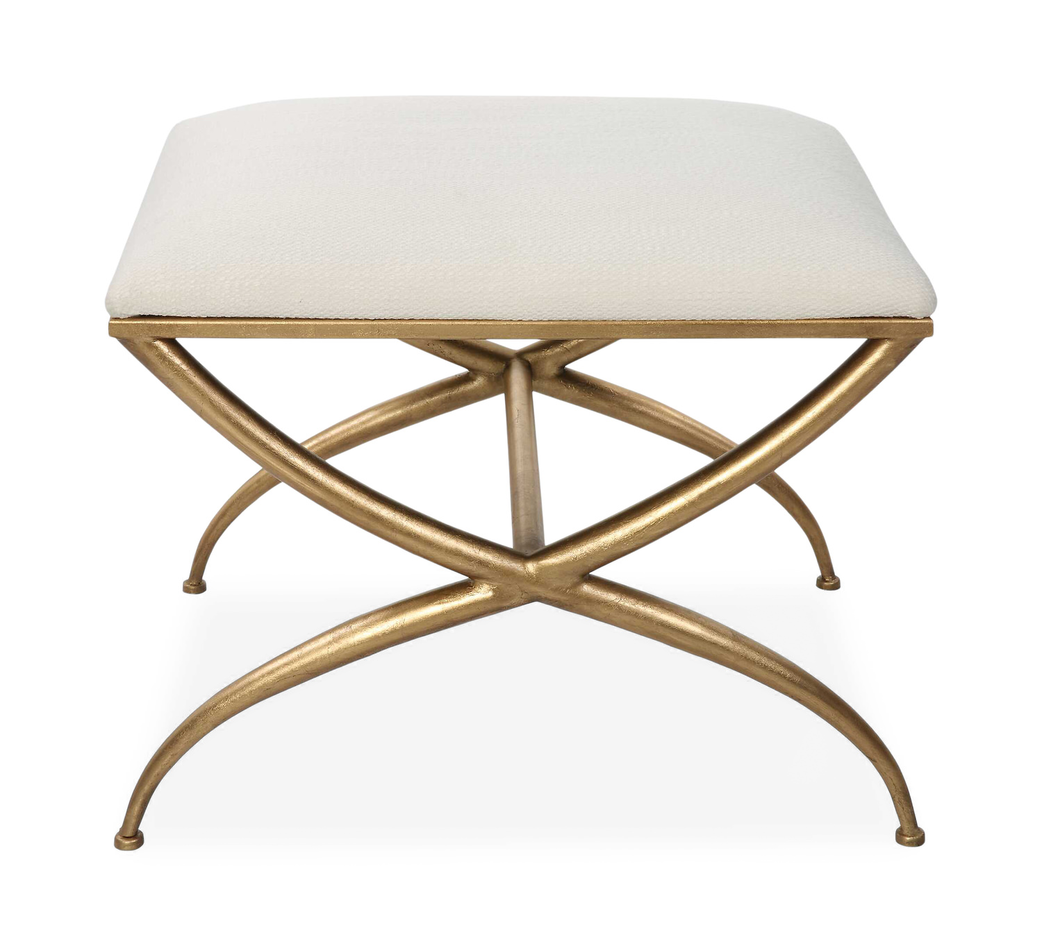 - Classic Yet Stylish, This Small Bench Features A Curved Iron Frame Finished In An Elegant Gold Leaf. The Cushioned Top Is Upholstered In A Crisp White Fabric, Doubling As A Comfortable Seat Or Footrest.