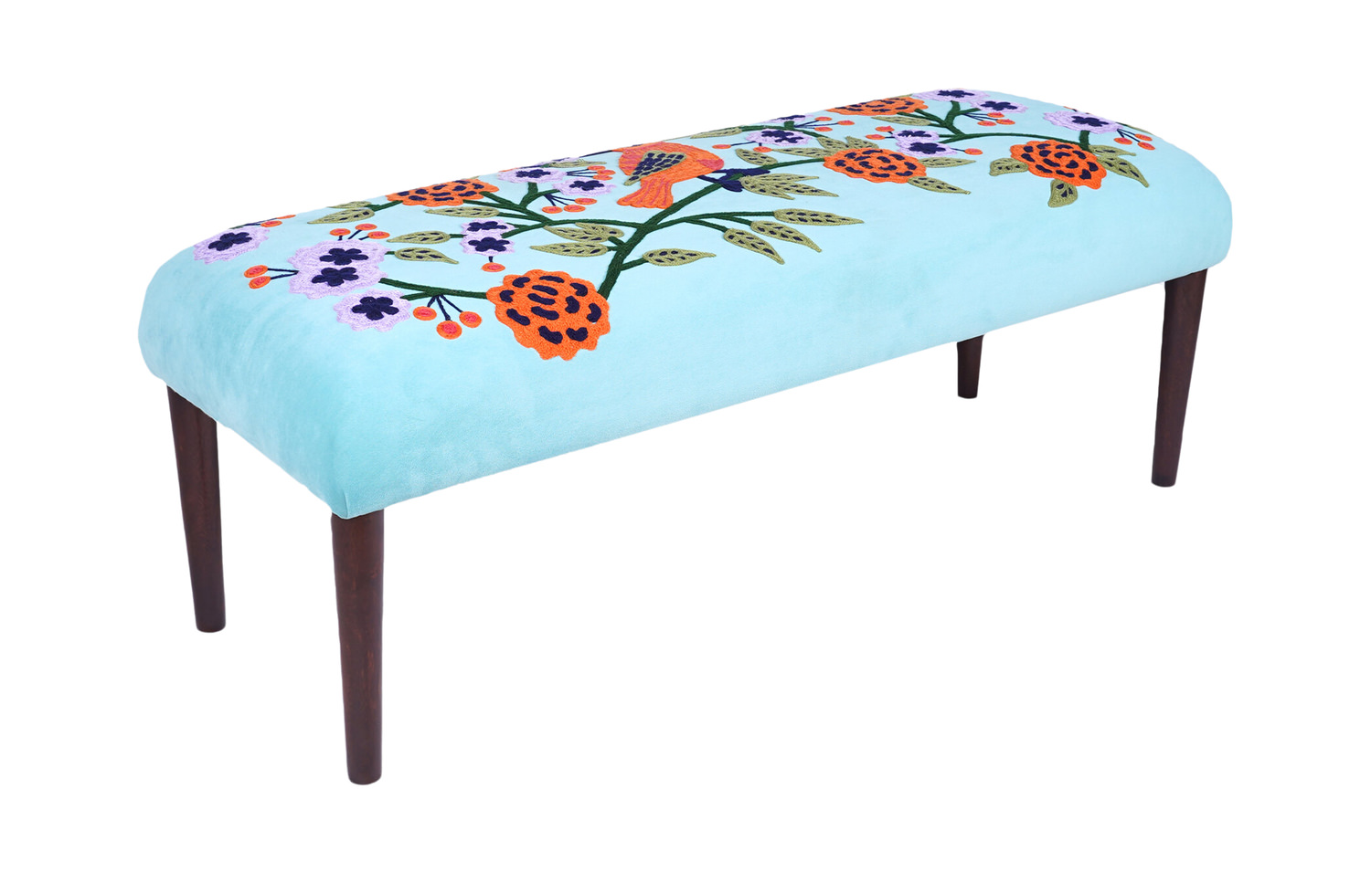 Introducing the exclusive Fee Accent Bench from HOM Furniture! Dive into a world of elegance and charm with this one-of-a-kind piece that is sure to steal the spotlight in your home. The light blue fabric covering the entire bench creates a sense of serenity and tranquility, while the hand-embroidered vine with delicate flowers adds a touch of whimsical beauty. Each intricate detail tells a story, making this bench a true work of art. Perfect for a spare room or living space, this bench is not just furniture - it's a statement. Add a touch of adventure to your décor with the Fee Accent Bench from HOM Furniture.