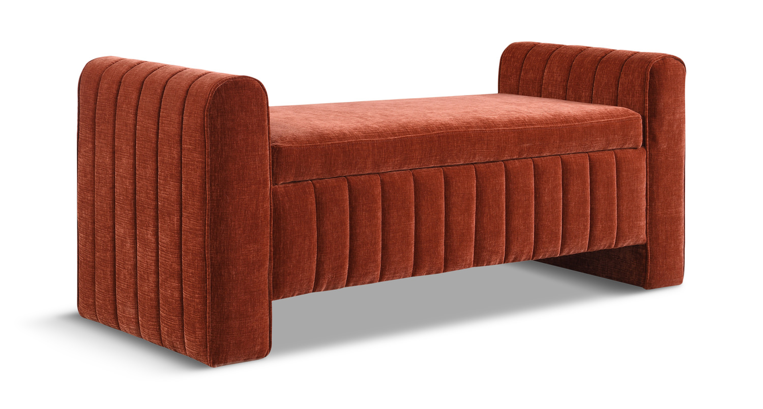 Introducing the Grace Storage Bench by HOM Furniture, a versatile piece that effortlessly combines style and functionality. Crafted with vibrant paprika polyester fabric, this bench adds a delightful pop of color to any space. With ample storage capabilities, it offers a convenient solution for tidying up your living area. Whether placed at the foot of your guest bed for a touch of elegance or used as a chic hallway bench, the Grace Storage Bench is sure to elevate your home décor. Add a stylish flair while staying organized with this must-have piece from HOM Furniture.