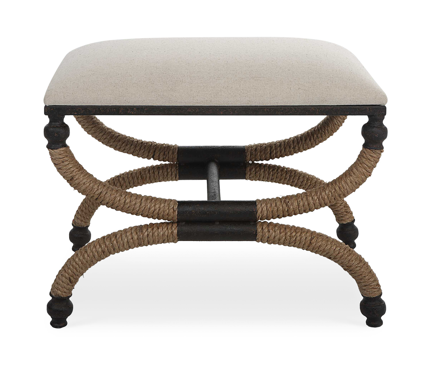 - The Icaria Bench Features A Rustic Curved Iron Frame With A Nautical Touch, Wrapped In Natural Fiber Rope Accents. The Cushioned Top Is Upholstered In An Oatmeal Cotton Blend Fabric.