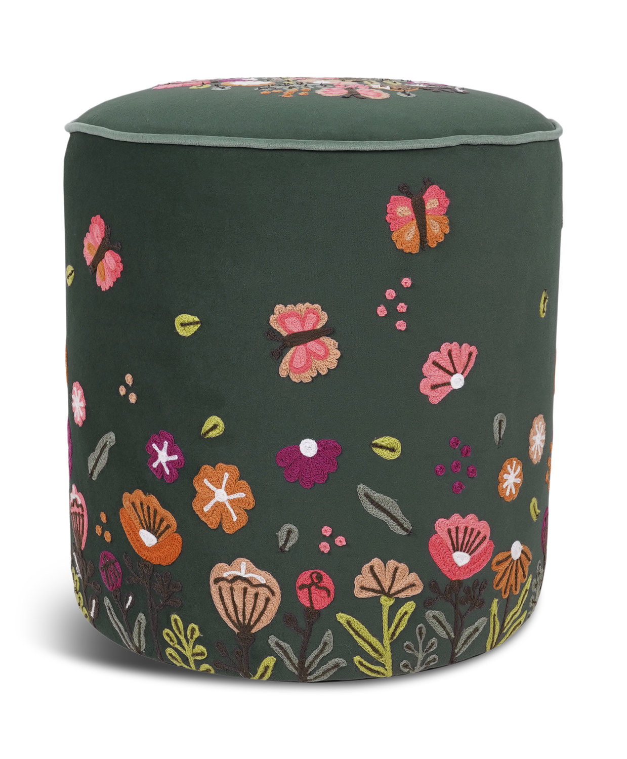 Introducing the Irene Ottoman from HOM Furniture, a true masterpiece that will elevate your space effortlessly. Made with luxurious green velvet fabric and adorned with a hand-embroidered floral pattern, this round ottoman is not only beautiful but also one-of-a-kind. Bring a touch of elegance and style to your home with the Irene Ottoman, perfect for adding a pop of color and sophistication to any room. A must-have piece for those who appreciate fine craftsmanship and unique design.
