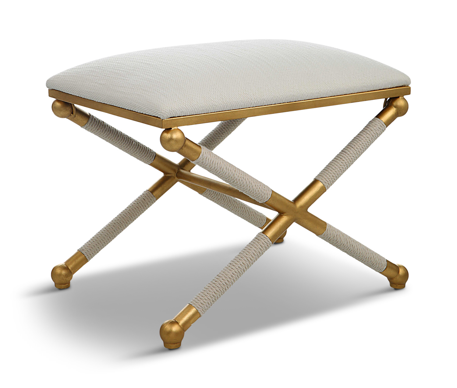 - With Classic Simplicity, This Small Bench Features A Smooth Iron Base Finished In An Elegant Gold Leaf With Braided White Rope Detailing, Upholstered In A Crisp Textured White Polyester Fabric.