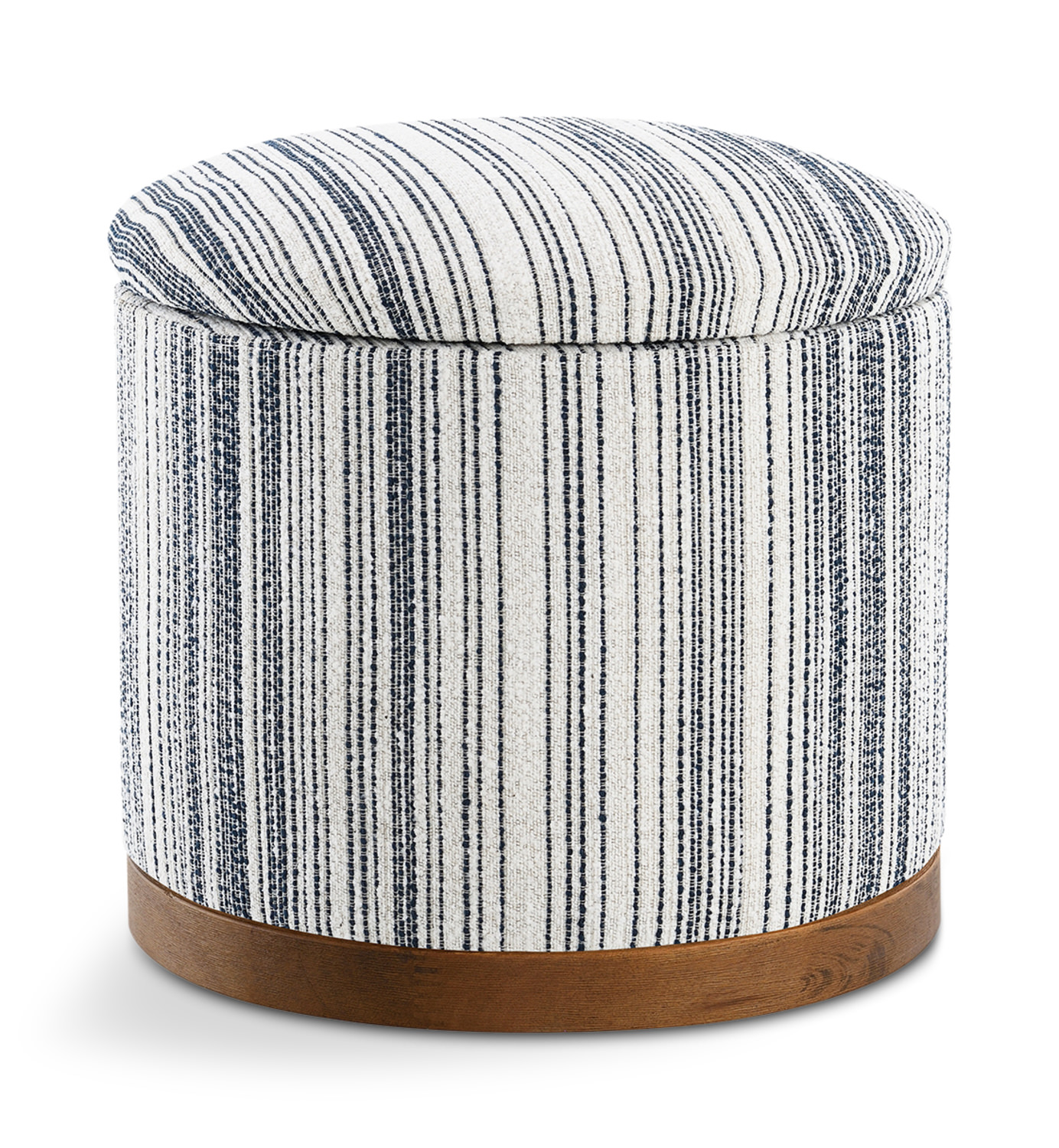 Introducing the Swivel Storage Ottoman from HOM Furniture, a versatile piece that effortlessly combines style and functionality. This ottoman features a charming striped pattern in blue and white, adding a touch of elegance to any room. Its casual design and simple storage make it a practical addition to your home, while the accented wood base provides a subtle yet stylish detail. The round shape of this ottoman allows for easy placement in any space, making it perfect for various rooms in your home. Elevate your décor with the Swivel Storage Ottoman, a piece that is as chic as it is convenient.