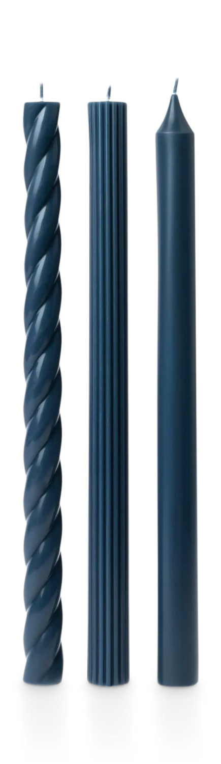 Introducing the Assorted Taper Candle Set Of 3 from HOM Furniture! This elegant set in a soft navy color is the perfect addition to your home décor. Each candle boasts an estimated burning time of 8 hours, allowing you to enjoy its warm glow for longer. Pair them with a complementary candle holder to create a captivating centerpiece or accent piece in any room. The box includes three candles in assorted styles; smooth, ribbed, and twisted, adding a touch of sophistication to your space. Illuminate your surroundings with style and grace with this charming candle set.