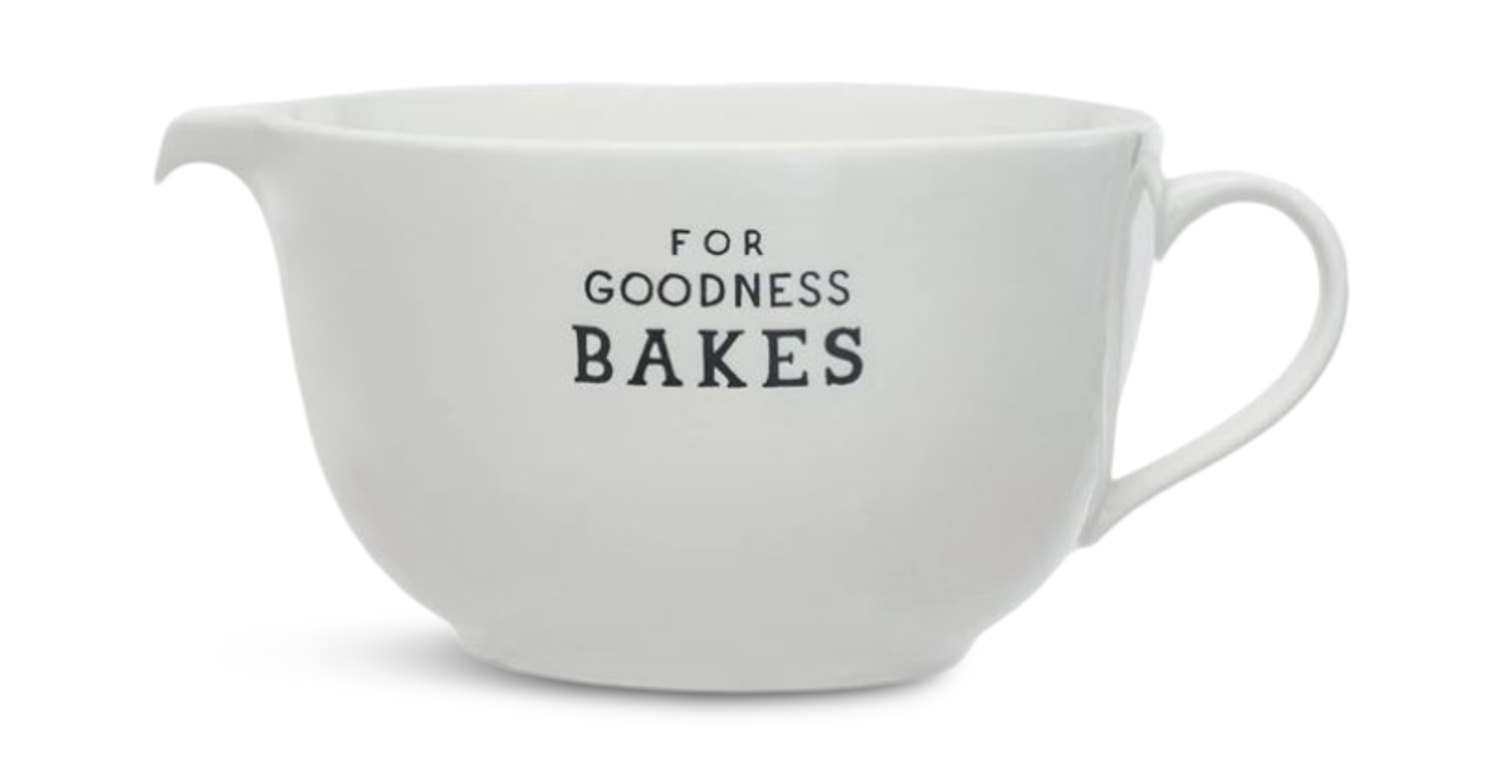 Introducing the HOM Furniture Stoneware Batter Bowl 4qt, a delightful addition to any baker's collection. This food-safe bowl is perfect for mixing up your favorite batters and doughs. With a clever saying on the front stating "For Goodness Bakes," this bowl is not only functional but also adds a touch of whimsy to your kitchen. Display it on your countertop for easy access and to showcase its charming design. Ideal for both practical use and as a decorative piece, the HOM Furniture Stoneware Batter Bowl 4qt is a must-have for any baking enthusiast.