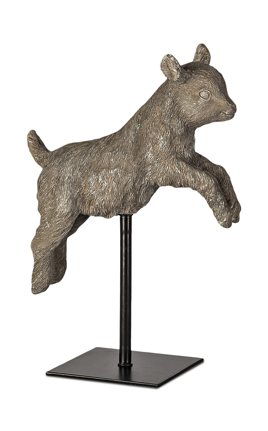 This adorable little "kid" is centered on a black metal stand; Billie II is a playful pose of a baby goat. A fun addition to any space in the house, this will be a point of interest for both children and adults. A happy-go-lucky type of accent, the cast, frolicking goat is constructed of resin.