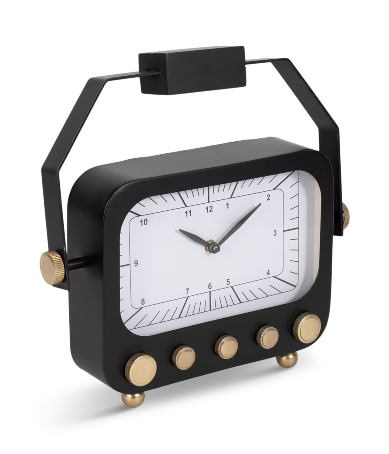 Introducing the sleek and stylish Black Tabletop Clock by HOM Furniture! This modern timepiece is designed with a black finish and adorned with elegant gold metallic feet and knobs, adding a touch of sophistication to any space. Perfect for your end table or office desk, this clock combines functionality with a contemporary aesthetic. Stay on schedule in style with this chic and versatile piece from HOM Furniture.