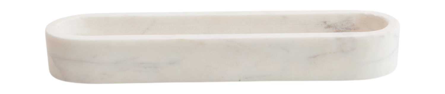 Oblong and oval, the Cracker Dish is of marble composition. A crisp, white color, with an edge, suitable for those delightful water crackers, mini-toasts or the like, this tray works great for serving/holding the foundational layer of the hors d'oeuvres for the evening.