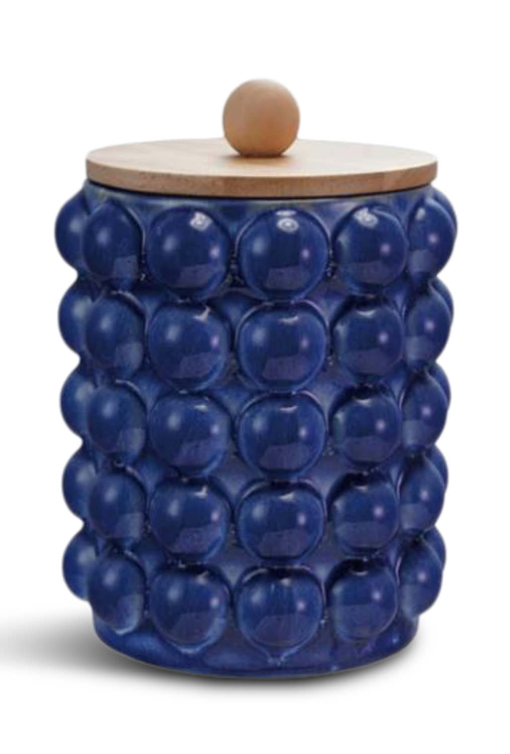 Introducing the Dotted Canister from HOM Furniture, a stunning addition to your kitchen décor. Each canister features raised dots, a sleek wood lid, and a unique reactive glaze in a captivating blend of blue and natural tones. Please note that as each piece is individually crafted, variations may occur, adding to its charm. For a truly striking display, consider purchasing all three canisters to create a beautiful trio that will elevate your countertops. Add a touch of elegance to your home with this exquisite canister set from HOM Furniture.
