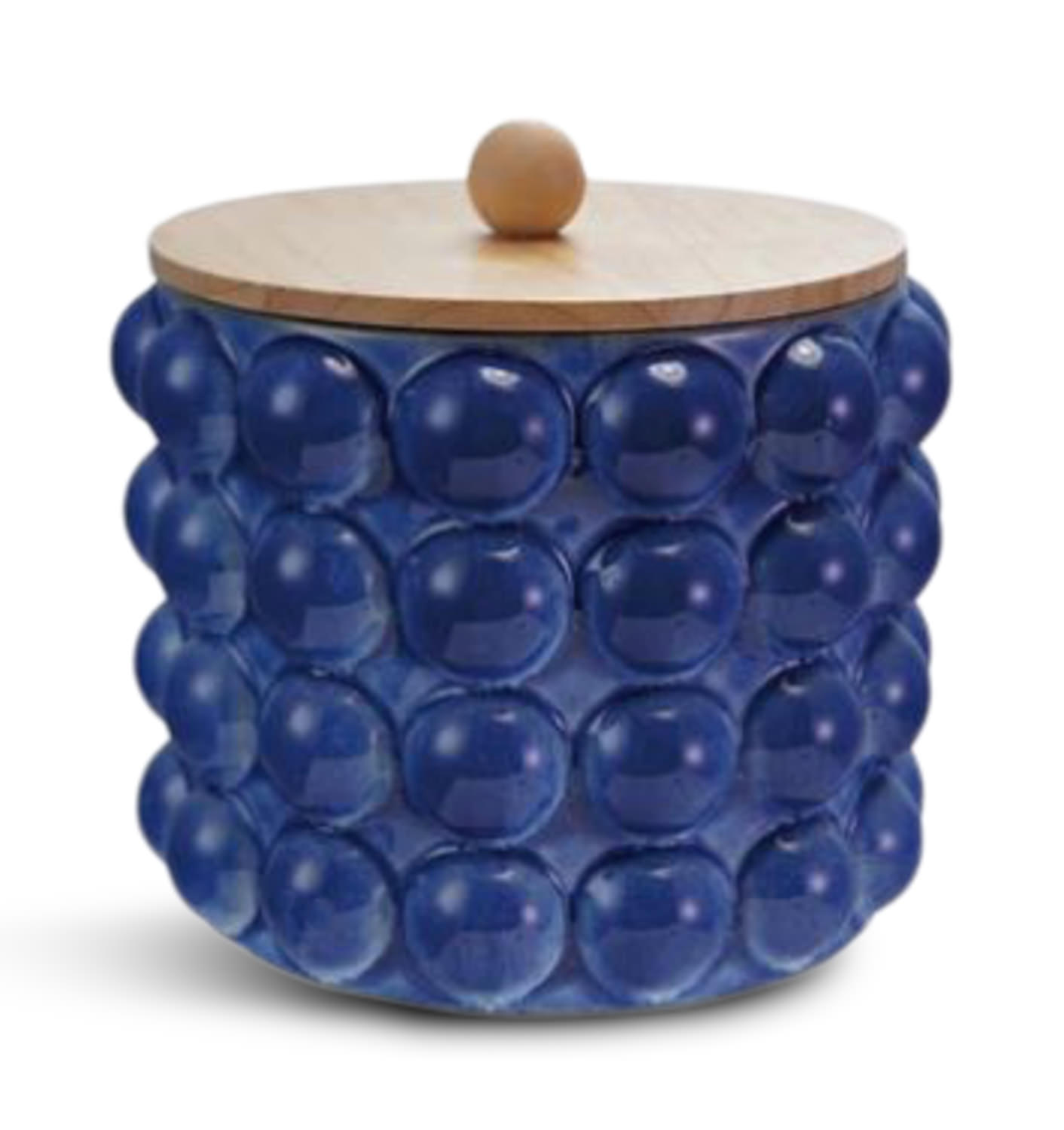 Introducing the Dotted Canister from HOM Furniture, a stunning addition to your kitchen décor. Each canister features raised dots, a sleek wood lid, and a unique reactive glaze in a captivating blend of blue and natural tones. Please note that as each piece is individually crafted, variations may occur, adding to its charm. For a truly striking display, consider purchasing all three canisters to create a beautiful trio that will elevate your countertops. Add a touch of elegance to your home with this exquisite canister set from HOM Furniture.