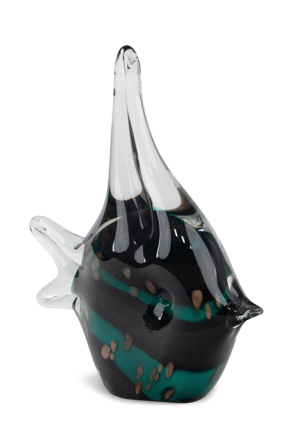 Introducing the charming Glass Fish Sculpture by HOM Furniture! Dive into a realm of whimsy and style with this playful piece that is sure to make a splash in your home décor. Crafted in the shape of a fish, its stunning striped blue coloring adorned with gold specs adds a touch of elegance and fun to any space. Let this unique sculpture swim its way into your heart and bring a wave of joy to your surroundings. Add a touch of aquatic allure to your home with this one-of-a-kind glass sculpture from HOM Furniture!