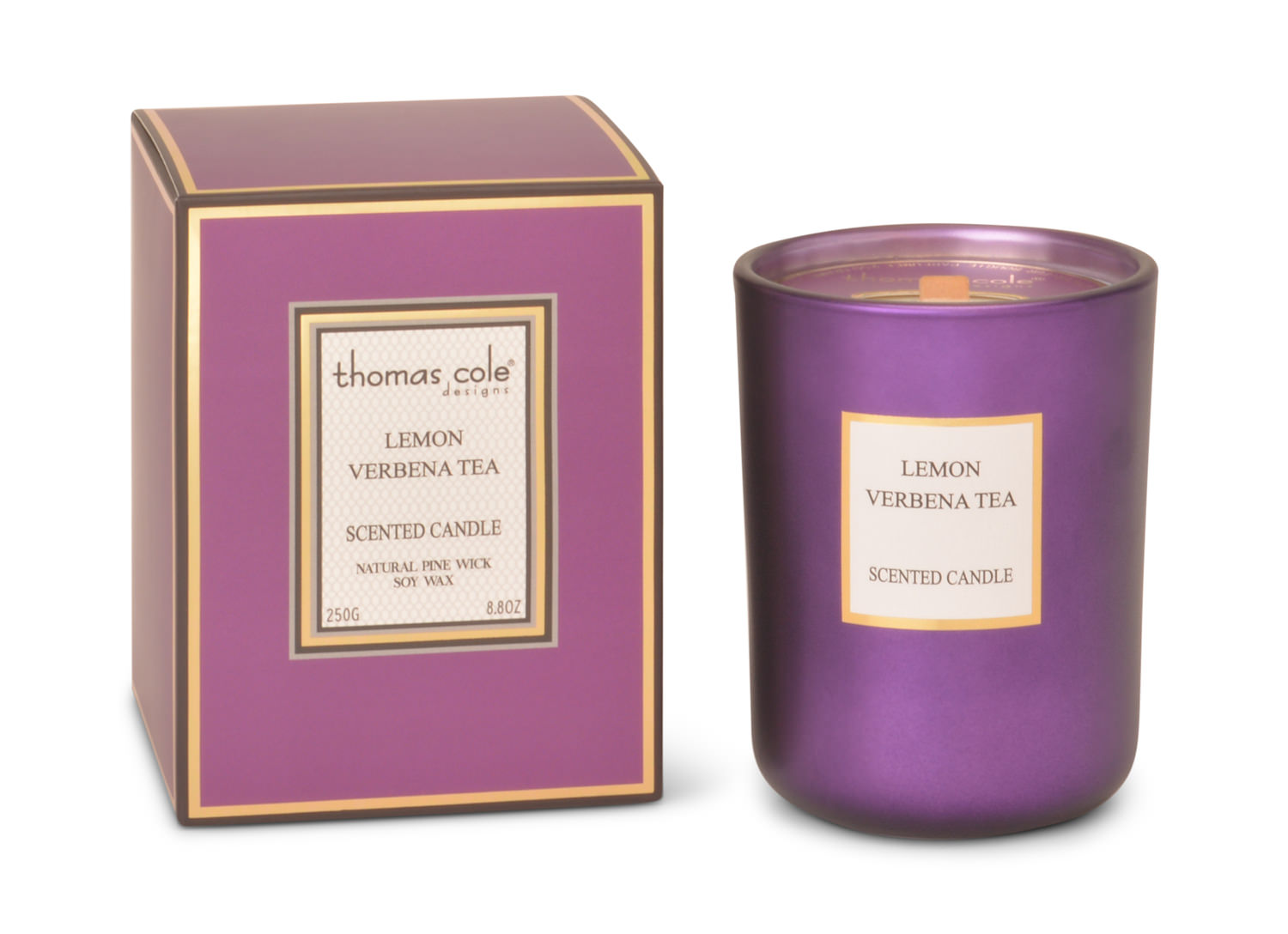 The Lemon Verbena Luxe Jar Candle will soon become your go to candle collection. The lovely scent of lemon mixed with a fresh floral will dance around your space when you take home one of these luxurious jar candles. The candle jar is made from glass and has been finished in a matte metallic violet shade of purple. The lidded jar has fluted lines that cascade from the top of the lid down to the bottom of the jar. The large candle has three wooden wicks to allow more fragrance to permeate your space. Add one of these beauties to your bedroom dresser to add a pop of color and an elegant accessory to your tabletop display.