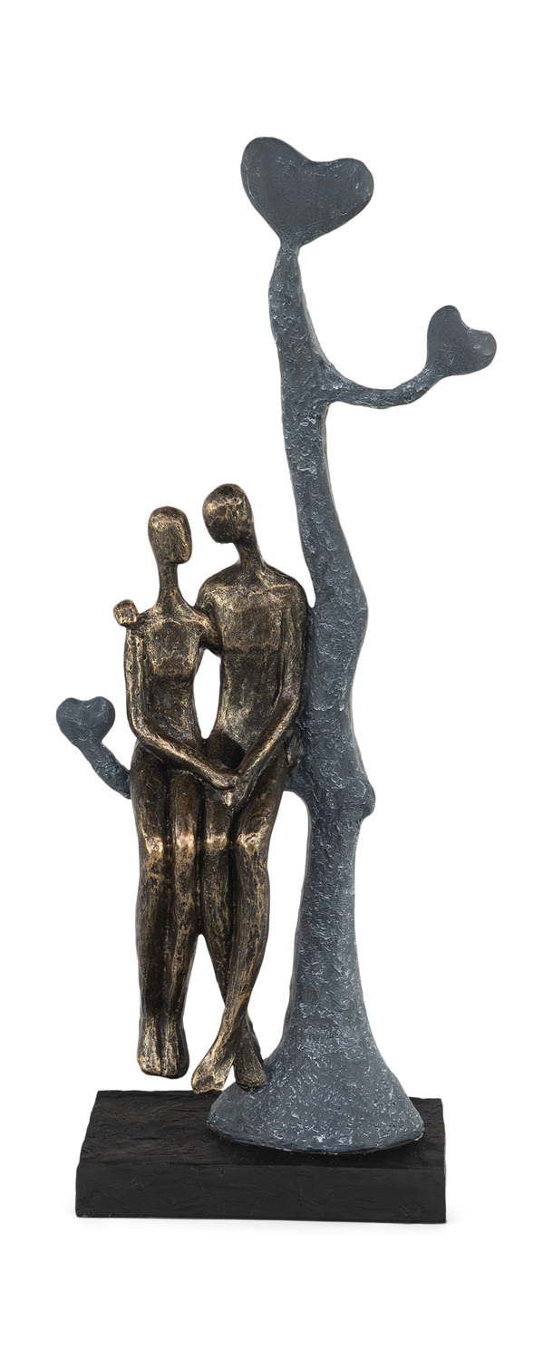 Nestled against a contemporary formed tree with a heart at the extension of the branches, the Love In A Tree Sculpture, is fashioned in resin. A mottled, grey finish, composes the tree and the couple are contrasted in bronze. A rectangular base, (black) supports the sculpture, with its unique expression of love.