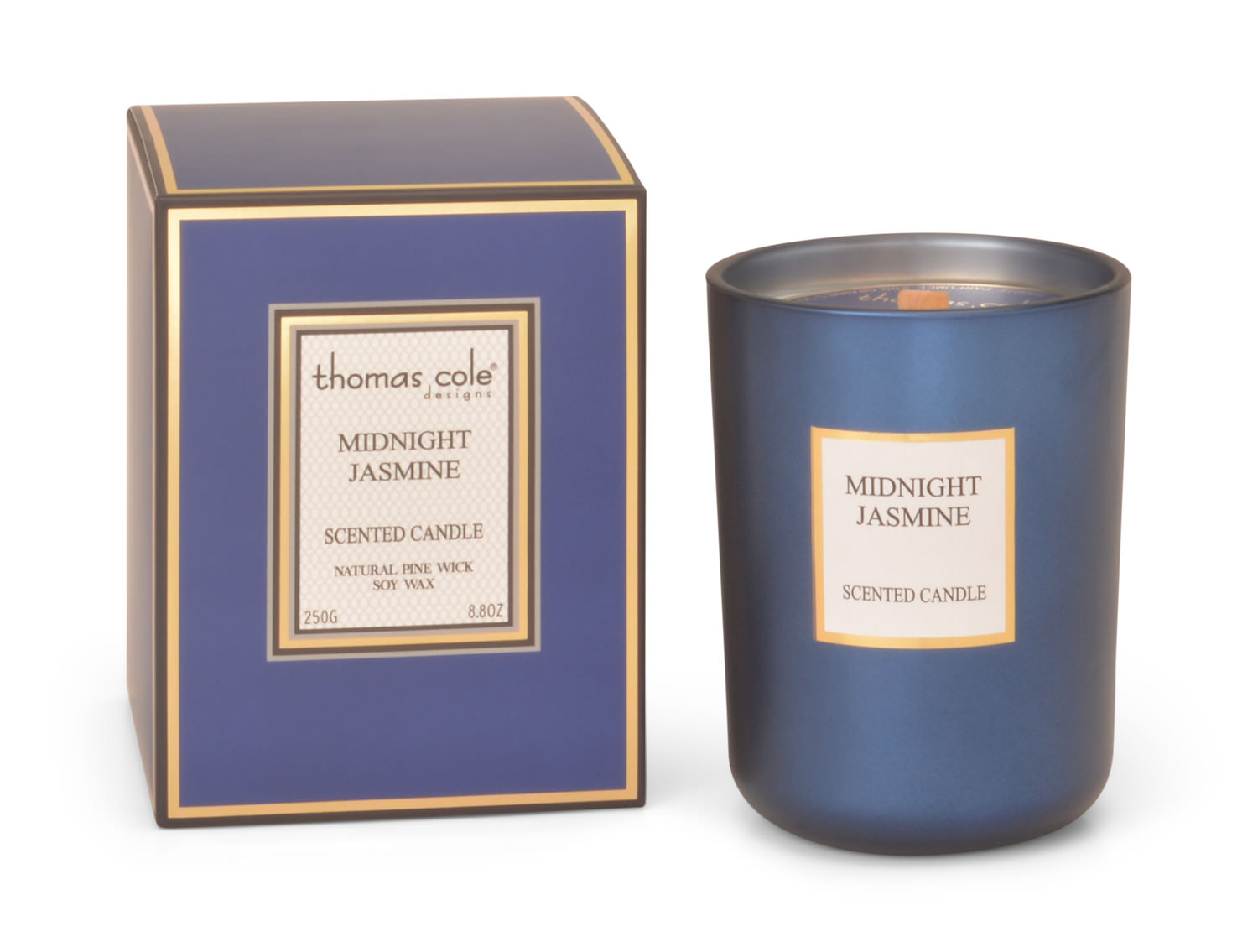 The Midnight Jasmine Luxe Jar Candle collection are so delightful that you will want one in every color. The jar is constructed out of glass and is finished in a matte metallic denim blue that will look wonderful mixed in to your tabletop displays. The lidded jar candle has a fluted design that runs from the top of the lid down to the bottom of the jar creating a unique design that is every so pleasing to the eye. The large jar candle has three wooden wicks so your room will fill with the deep scent of jasmine. Use one on your kitchen counter top to have create a wonderful aroma during all times in the day. The denim blue will also make a lovely pop of color in any room of your home.