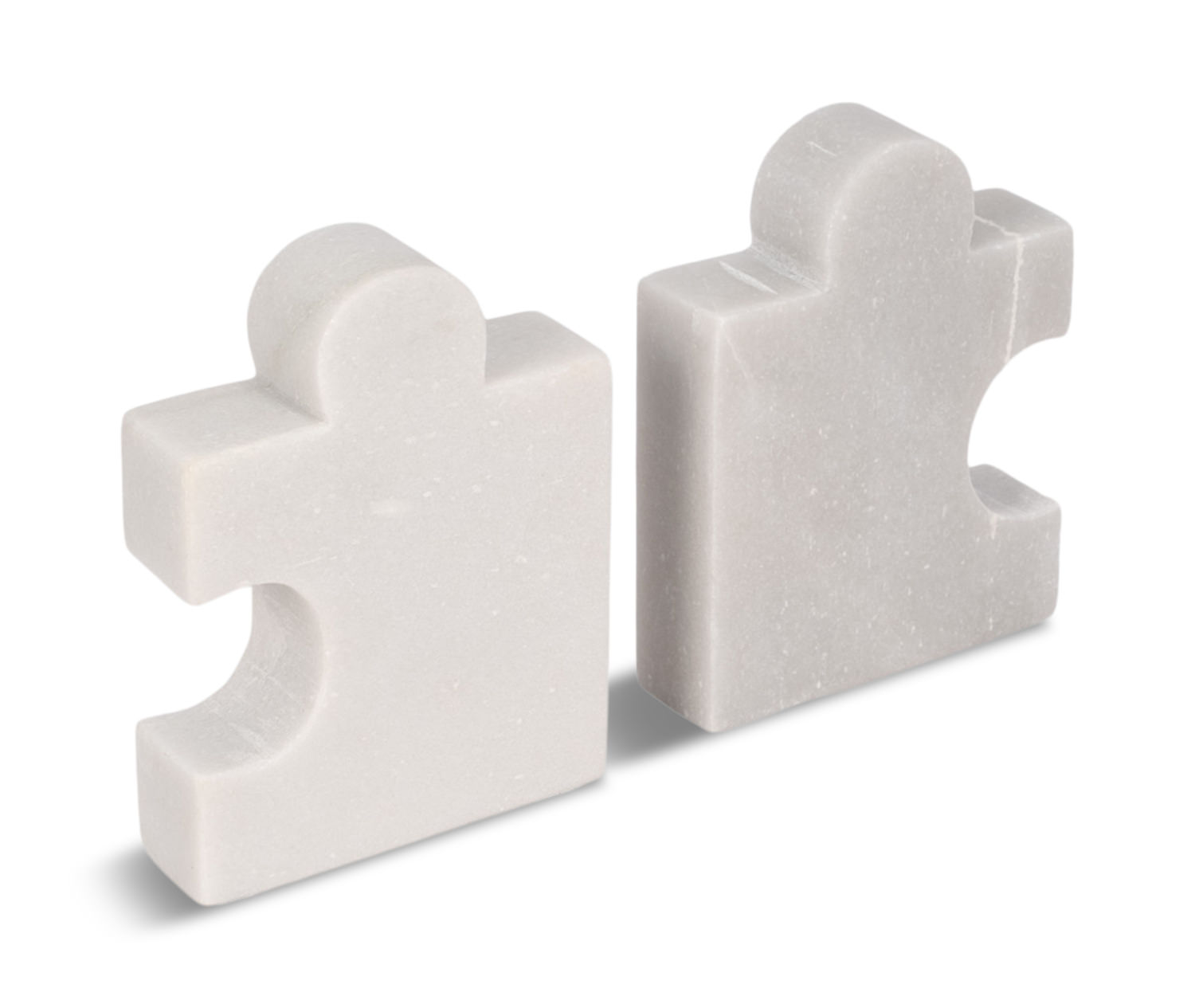 Introducing the HOM Furniture Puzzle Piece Book Ends - a unique and charming addition to your home décor! Made of elegant white marble, this set of 2 bookends features two puzzle pieces that fit together perfectly. These bookends are not only functional but also add a touch of sophistication to any bookshelf or tabletop. Add a playful yet stylish touch to your space with these one-of-a-kind bookends from HOM Furniture.