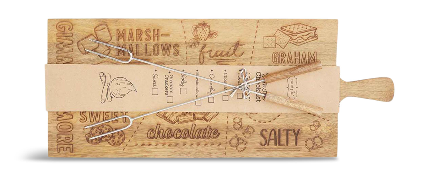 Introducing the S'more Map Board Set by HOM Furniture - a must-have for your next hosting event! Crafted from luxurious mango wood, this elegant board features an engraved presentation "map" to suggest perfect placement for your s'more ingredients. Complete with both wood and metal roasting sticks, this set is designed to help you create a showstopping presentation while making delicious treats. Elevate your hosting game with the S'more Map Board Set from HOM Furniture.