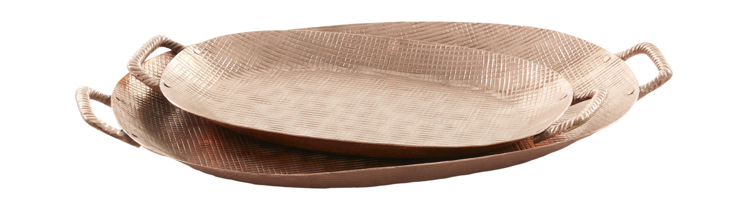 This Set of Two Rustic Trays from HOM is perfect for adding an extra touch of style to your home decor. With casual influence and a rustic bronze finish, the aluminum construction ensures both style and durability. Perfect for holding decorative accessories, these medium-sized trays with a scored grid texture, will add a great touch to any space. Please note that they are not food-safe, but make an eye-catching addition to any home.