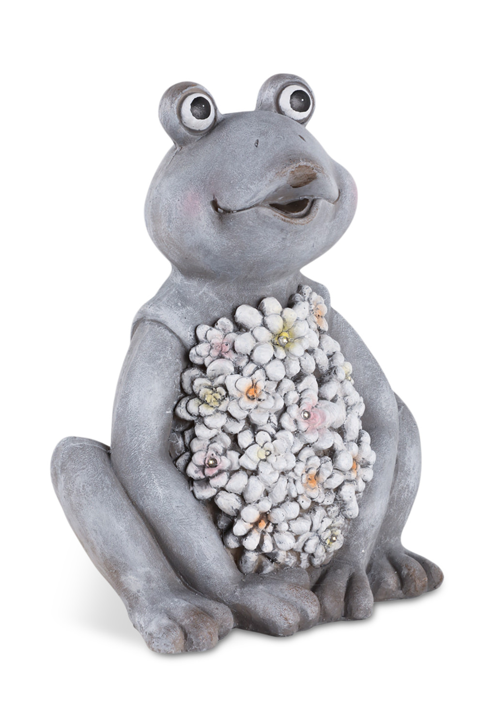 Introducing the charming Sitting Frog With Solar Flowers from HOM Furniture! This delightful grey ceramic frog statue is not your ordinary décor piece - with a beautiful arrangement of white flowers adorning its front, and central light bulbs that light up magically with solar power. The small hints of color from the flowers add a pop of vibrancy to any space, while the intricate pattern of flowers displayed adds an extra touch of elegance. Bring this unique and whimsical creation into your home or garden and watch as it lights up your space with its enchanting beauty.