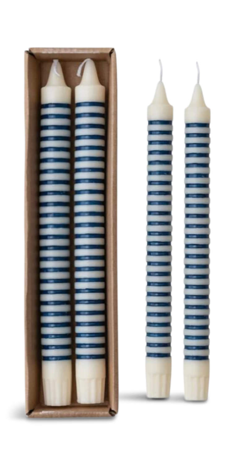 Introducing the Striped Taper Candle Set Of 2 from HOM Furniture. Elevate your space with this elegant and timeless addition to your décor. These unscented white candles feature chic blue stripes for a touch of sophistication. Each set includes 2 candles, perfect for creating a harmonious ambiance in any room. With an estimated burning time of 6 hours, these candles are not only stylish but long-lasting. Pair them with a complementary candle holder to complete the look. Add a touch of class to your home with the Striped Taper Candle Set Of 2 from HOM Furniture.