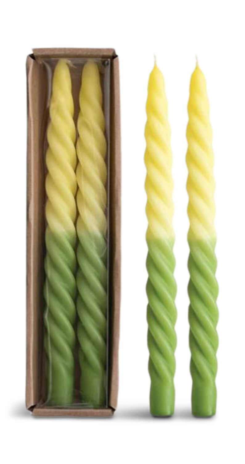 Introducing the Twisted Taper Candle Set Of 2 from HOM Furniture, perfect for adding a touch of elegance to your home décor. With a unique twisted pattern and yellow to green ombre coloring, these unscented candles are sure to bring interest to any space. Each set includes two candles neatly packaged in a box, making them ideal for gifting or personal use. These tapered candles have an estimated burn time of 7 hours, allowing you to enjoy their warm glow for extended periods. For a complete look, pair them with eye-catching taper candle holders.